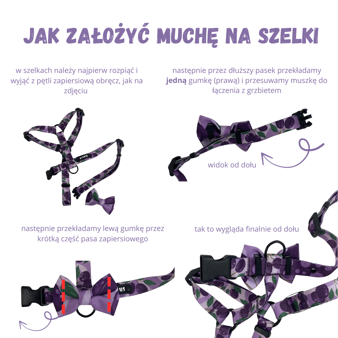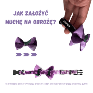 Pieska muszka o szerokości 9cm, z tyłu dwie gumeczki, przez które należy przełożyć obrożę. Muszka solidnie się trzyma, uszyta z wodoodpornej tkaniny.